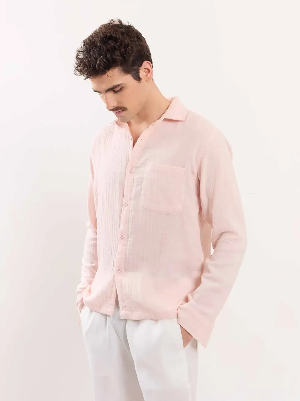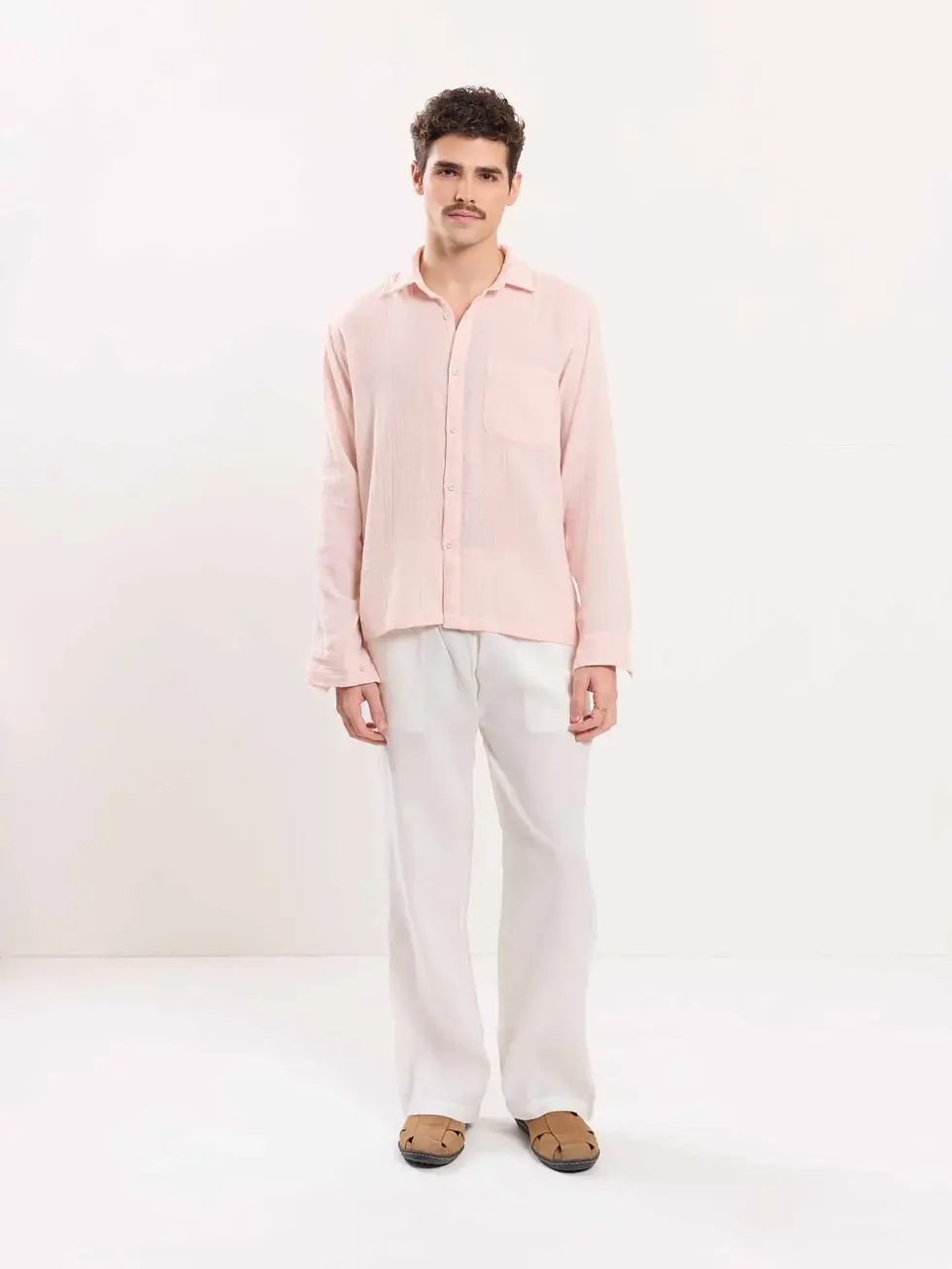 Boxy fit shirt in airy double gauze cotton with a spread collar, a classic front, and a straight hem. Low dropped shoulders, long sleeves with buttoned cuffs, and a patch chest pocket